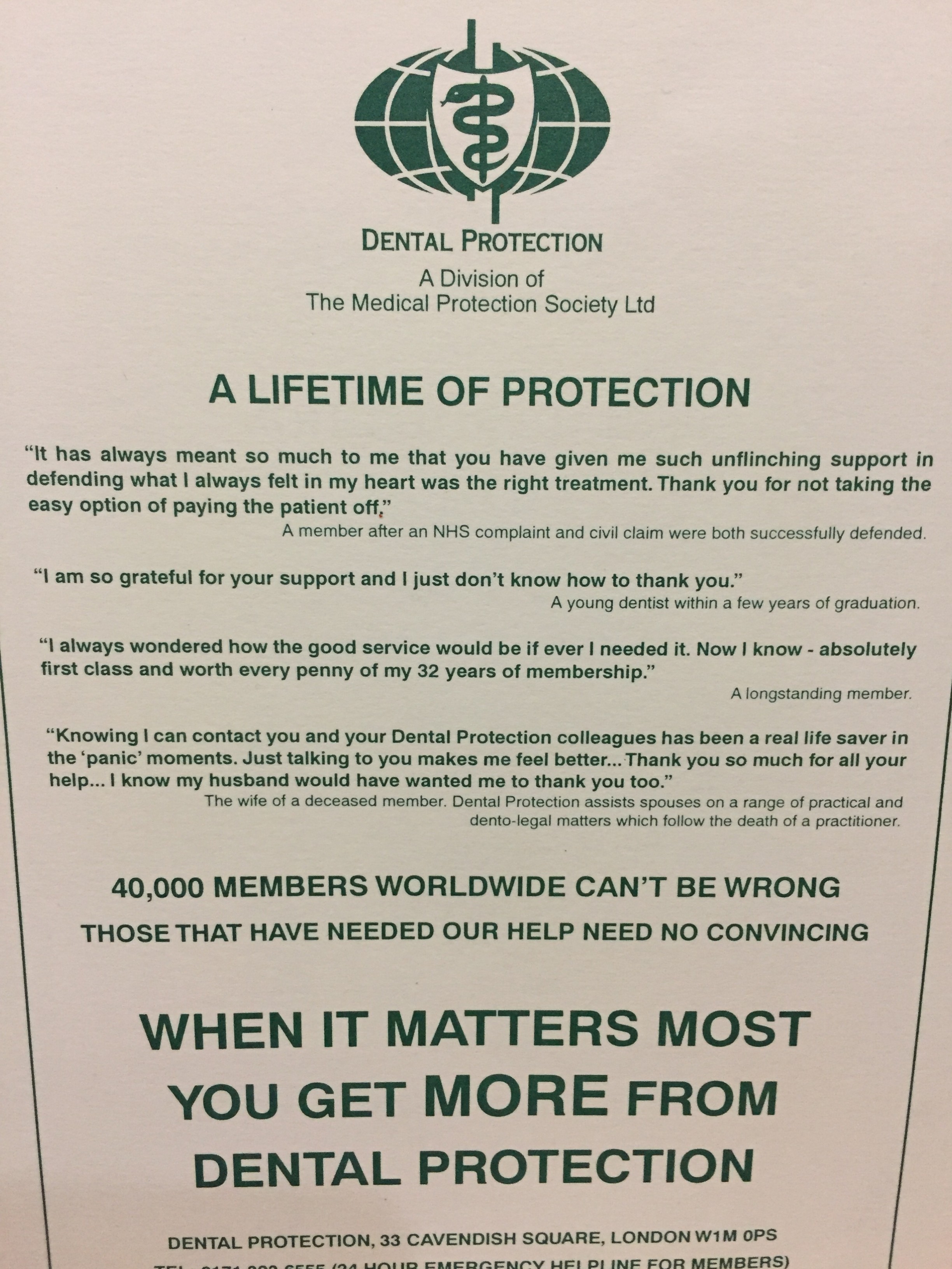 This was demonstrated to me recently by someone who attended one of our courses and then corresponded by email afterwards (name withheld). When they qualified some years ago Dental Protection sponsored a qualification dinner in Yorkshire. The quotes on the back of the programme for the dinner, which were showing the ethos and benefits of Dental Protection are very poignant in respect of how the strategy has obviously changed. There is a photograph of the programme below, just read the quotes for yourself.