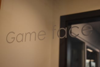 Game face isn't at eye level in front of you as you walk through the doors to ensure you put your game face on; it's asking you a question.