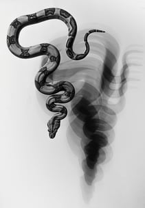 A metaphor that I love for explaining situations where people are prepared to sacrifice their values, or their future, or even their friends and family, to get the thing they want now is that of the snake eating itself. And so, imagine we have a snake with the most beautiful and magnificent head, massive poisonous fangs, bright yellow eyes, ready to pounce.